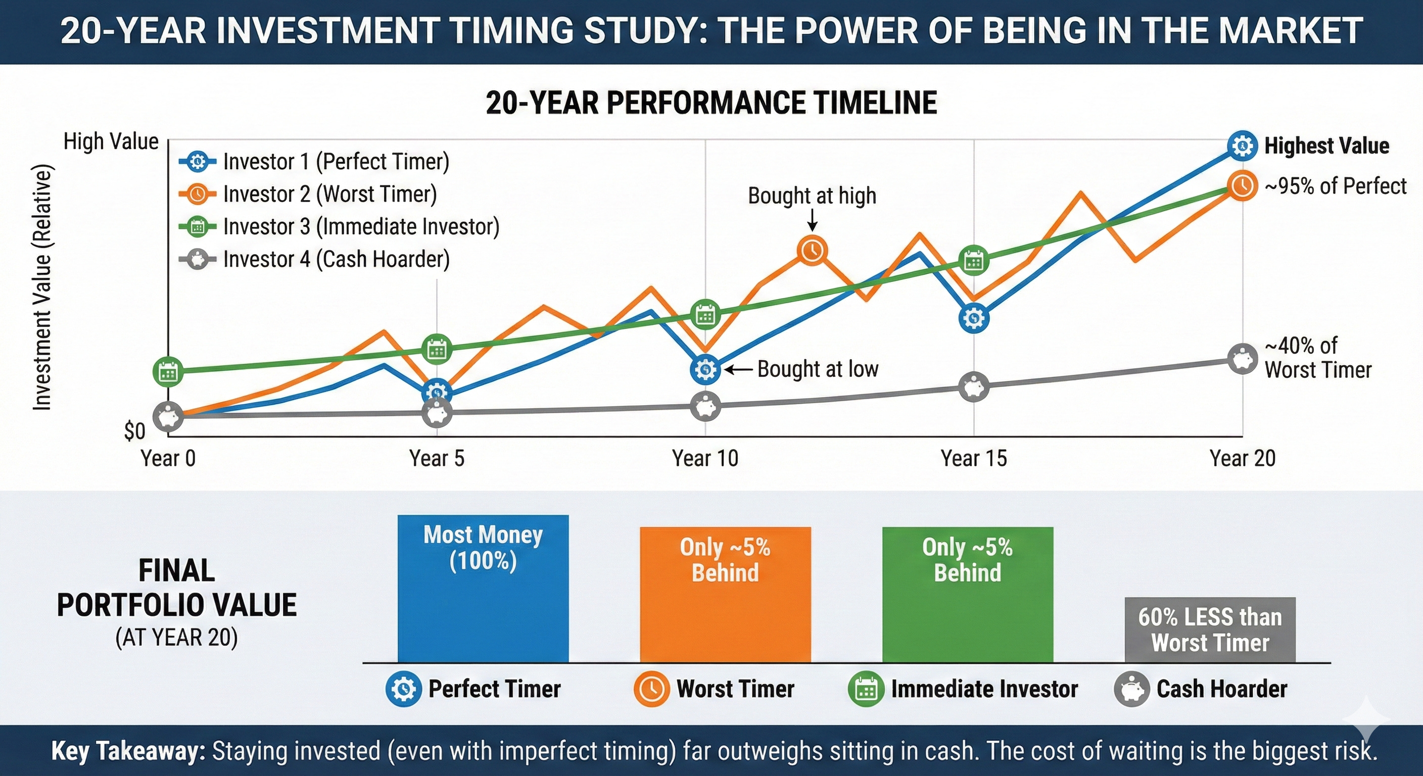 After 20 years, the perfect timer made the most money, but the worst timer and the immediate investor were only 5% behind. All three crushed the person who sat in cash, who had 60% less money than even the worst timer.