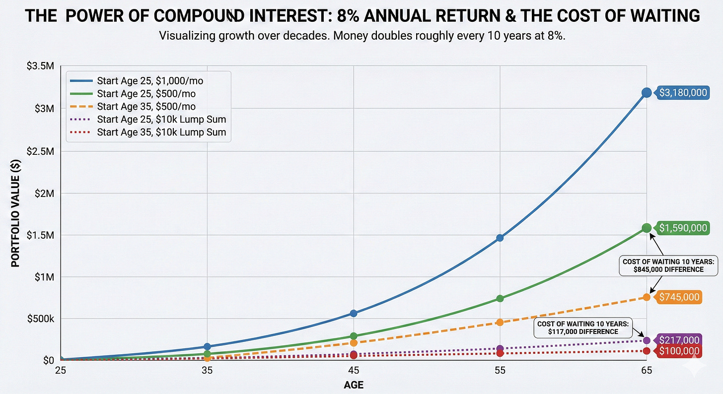 The money you make starts making money, then the money that money made starts making money, and this cycle repeats for decades. Your money roughly doubles every 10 years at 8% returns.