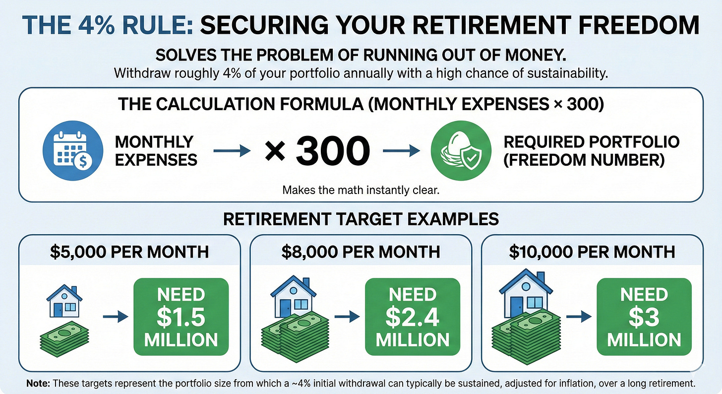 To calculate this number, just take your monthly expenses and multiply it by 300 to figure out how much you need.