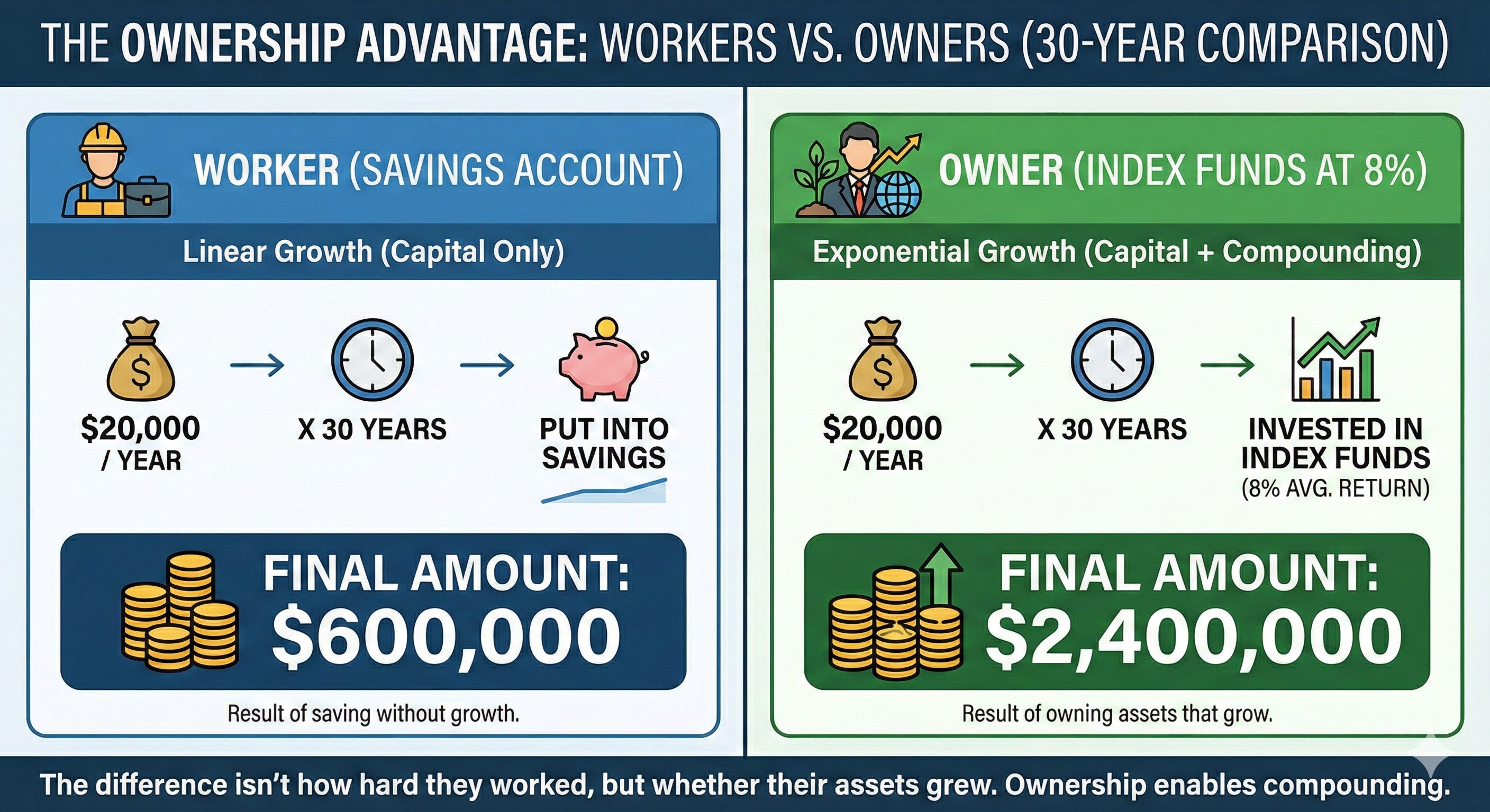 Now take that same $20,000 per year and buy ownership in businesses that grow at 8% every year. After 30 years you have $2.4 million because owners capture growth while workers capture wages, and growth builds on itself while wages don’t.